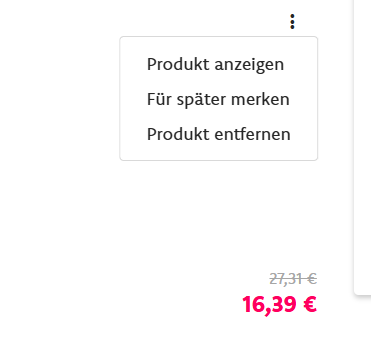 - Artikel entfernen: Du siehst nun alle Artikel, die Du aktuell in Deiner Shoppingbag hast. Suche den Artikel heraus, den Du nicht mehr kaufen möchtest. Klicke auf die drei Punkte und auf "Produkt entfernen". Anschließend wird Dein Produkt aus der Shoppingbag entfernt. Wenn du mehrere Artikel in Deiner Shoppingbag hast, wiederhole diesen Vorgang für jeden Artikel, den Du entfernen möchtest.